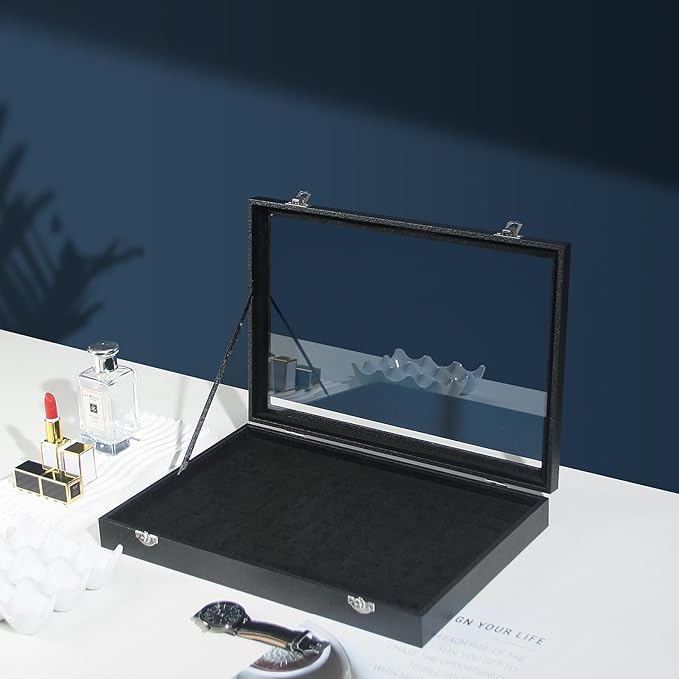 - Instead of cheap plastic lid, we us thick clear glass window at the top of the jewelry case, that allows you to see all the jewelry at a glance.