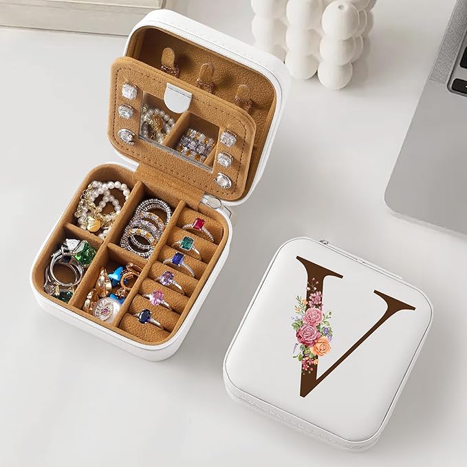 Parima Christmas Stocking Stuffers Gifts Aunt Gifts - Auntie Birthday Gifts, White Initial Jewelry Box - Letter V, Travel Jewelry Case