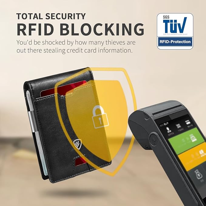 - RFID Blocking Protection - This rfid wallet for men is tested by an independent German quality control institute, specifically to block 13.56 MHz or higher RFID signals and protect against data theft by RFID scanners