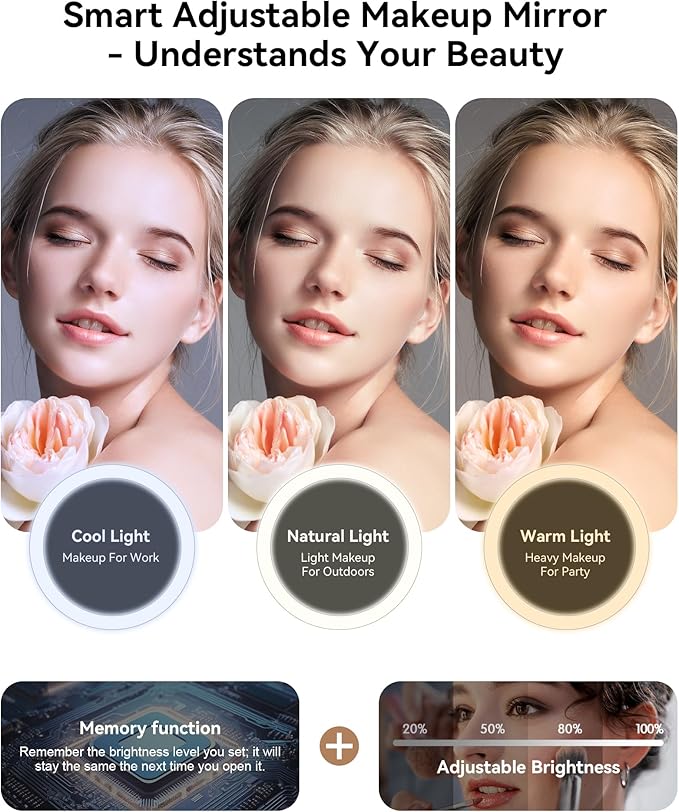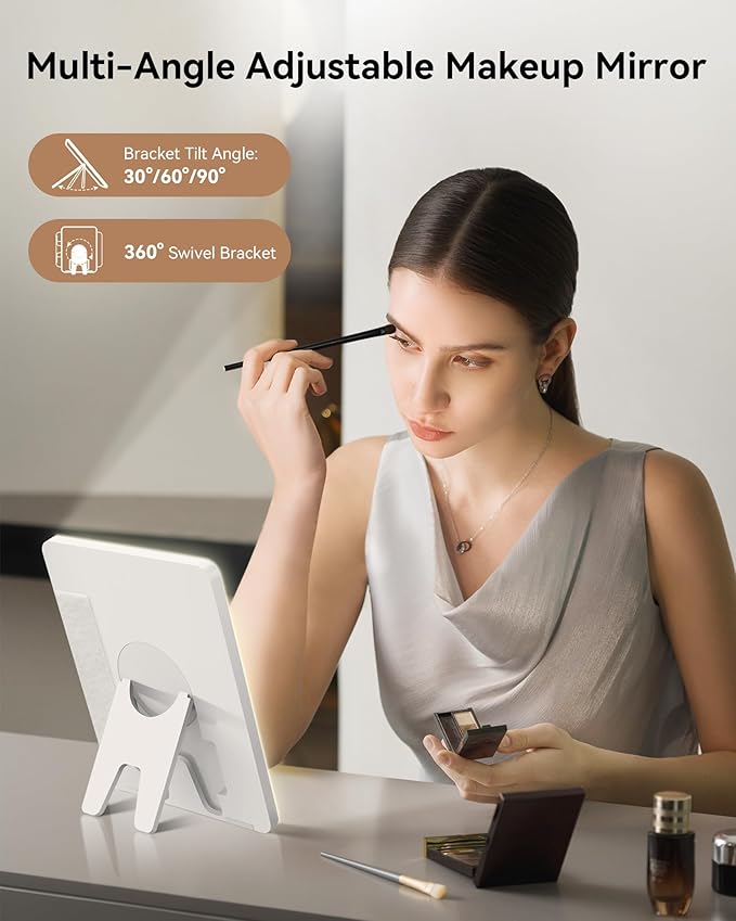 - 💡【SMART THREE-COLOR FILL LIGHT MIRROR】Smart fill light mirror with light intensity memory function, usable independently. Mirror stand adjusts 360° & 30°, 60°, 90°. Touch switch adjusts cool, natural, warm light, revealing true skin and facial details. Confidently face any makeup scenario. Long press for brightness control, unaffected by environment. 2000mAh battery removes battery worries.