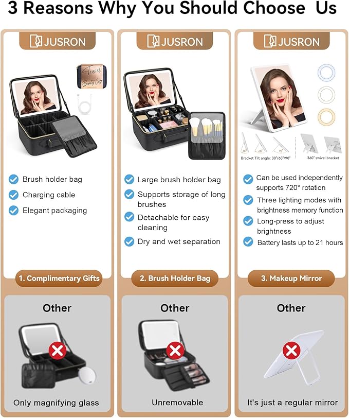 - 💄【DETACHABLE MAKEUP STORAGE BOX】JUSRON's makeup case is equipped with six detachable shock-resistant EVA partitions, allowing for customizable storage space based on different cosmetics. Say goodbye to messy makeup bags as it protects your cosmetics from damage or leaks. The included spacious brush bag enables you to carry more makeup brushes while also maintaining the cleanliness and dryness of the makeup case.