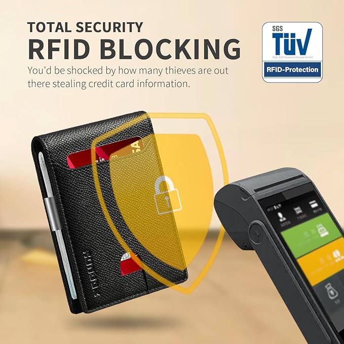 - 𝐑𝐅𝐈𝐃 𝐀𝐧𝐭𝐢-𝐓𝐡𝐞𝐟𝐭 𝐒𝐄𝐂𝐔𝐑𝐈𝐓𝐘 - this slim wallet for men equipped with German Instiute Certified RFID Security technology, a unique metal composite, engineered specifically to block 13.56 MHz or higher RFID signals to protect the valuable information and privacy