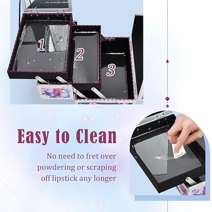 - Cosmetic Case with Mirror: With an extendable cantilever 2-tier tray and a mirror attached to the top tray, the makeup train case lets you see all your items at a glance, making dressing up quicker and easier.