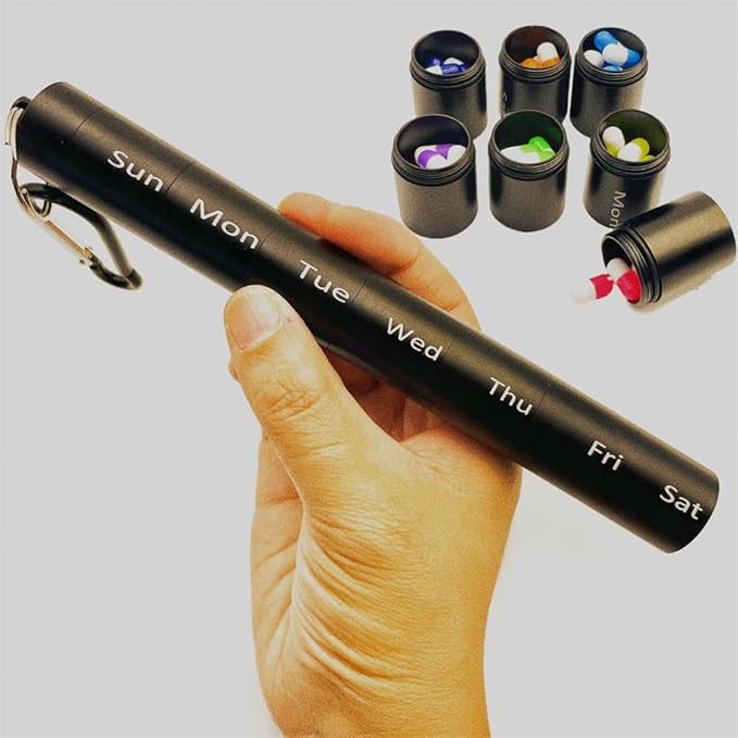 - 【Compact Size】: The metal travel pill case measures 7.4 inches in length and 0.97 inches in diameter. Each compartment has a depth of 0.86 inches, providing ample space for your pills. It comes with a keyring and carabiner, allowing you to easily attach it to your bag or keychain. Its compact size design ensures it doesn't take up much space, making it perfect for travel.