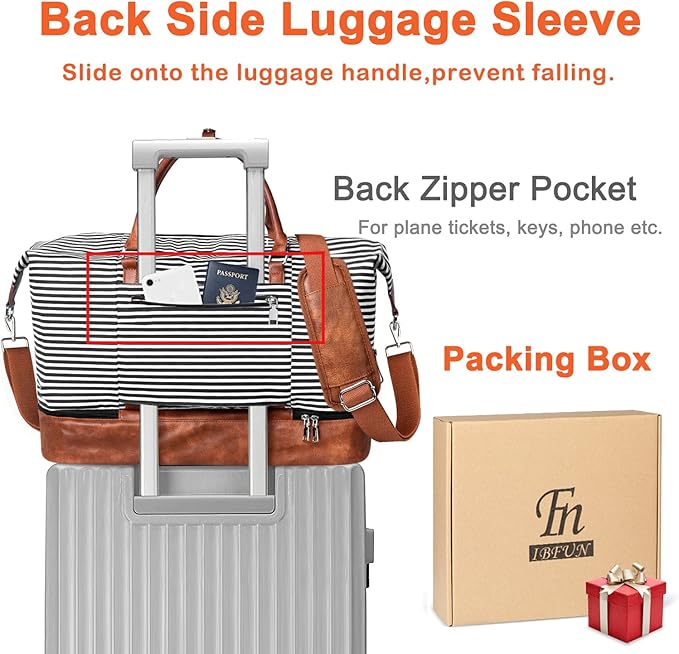 - Back side luggage sleeve allows you to slide it over the handle of rolling suitcase or luggage, preventing overnight bag falling and opening your hands. A zipper pocket on the back to hold your phones, ID cards or passports, easy to take any time. There are 3 inner pockets to store small items separately.