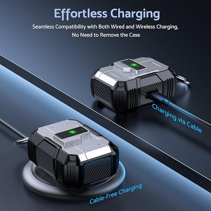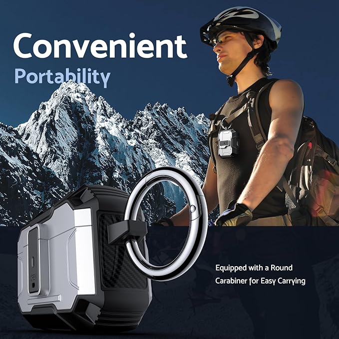 - 【Convenient Charging & Portability】The case supports both wired and wireless charging for your AirPods Pro case. The front LED remains visible to show the charging status. An included portable carabiner allows you to conveniently take your AirPods Pro case with you during outdoor activities like climbing, hiking, and travelling.
