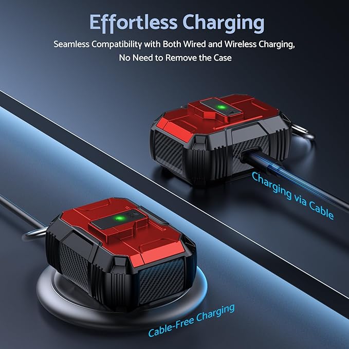 - 【Convenient Charging & Portability】The case supports both wired and wireless charging for your AirPods Pro case. The front LED remains visible to show the charging status. An included portable carabiner allows you to conveniently take your AirPods Pro case with you during outdoor activities like climbing, hiking, and travelling.