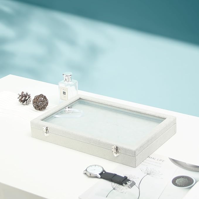 - Instead of cheap plastic lid, we us thick clear glass window at the top of the jewelry case, that allows you to see all the jewelry at a glance.