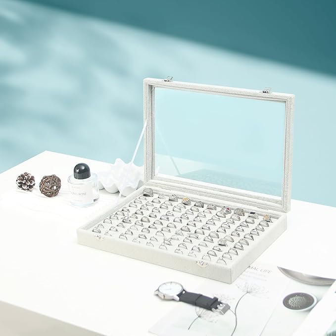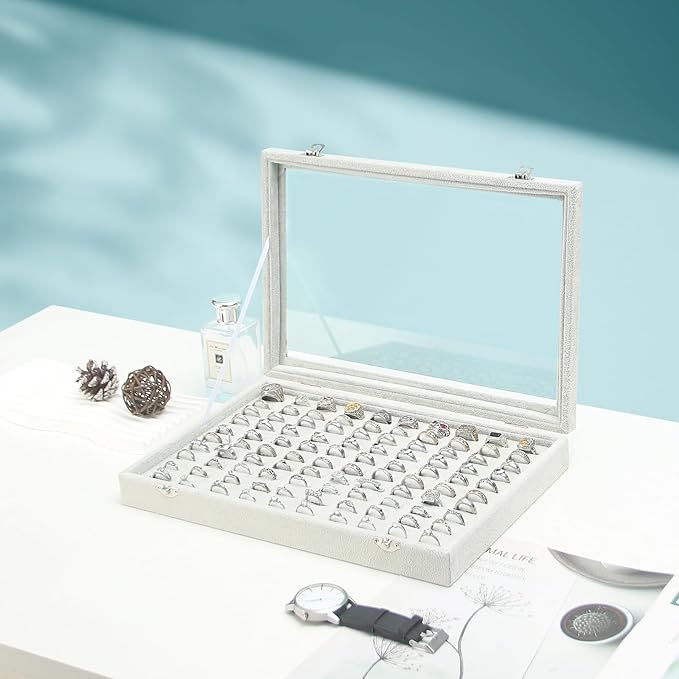 Coward Ring Organizer Jewelry Tray Box, Grey Beige Velvet 100 Slots Ring Display Tray Case with Transparent Glass Lid for Home Use or Store Selling Show