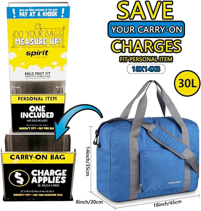 For Spirit Airlines Personal Item Bag 18x14x8 Foldable Travel Duffel Bag Underseat Carry-on Luggage for Women and men 30L(Blue)