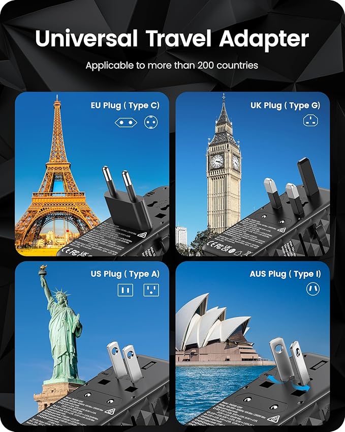 - 【Ideal for Travel】This International travel adapter is equipped with 4 interchangeable UK/US/EU/AUS plugs, and supports universal voltage of 100V-250V, which is suitable for worldwide travel for over 200 countries. Type C Plug: Most of Europe, France, Germany, Italy, Spain, Iceland, Greece, Israel; Type G Plug: UK, Ireland, London, England, Scotland, Dubai; Type I Plug: China, Australia, New Zealand; Type A Plug: USA, Japan, Canada. Take this travel essentials along on your next trip and enjoy your holiday!