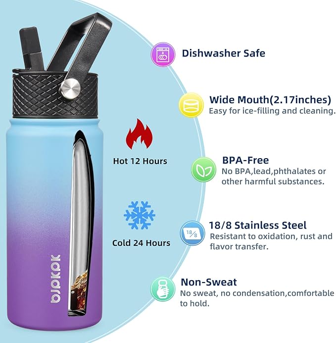 - 2 PACK INSULATED WATER BOTTLE: BJPKPK insulated water bottles with straw lids use double-walled vacuum insulation technology to keep your beverage cold for up to 24 hours, or hot for up to 12 hours, make sure you enjoy your favorite beverages at the most suitable temperature all day