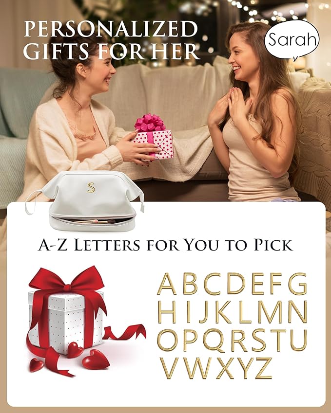 Birthday Gifts for Girls, Initial Large Makeup Bag, Personalized Double Layer Cosmetic Bag with Makeup Brush Organizer, Large Capacity PU Leather Travel Toiletry Bag Travel Stuff for Girls