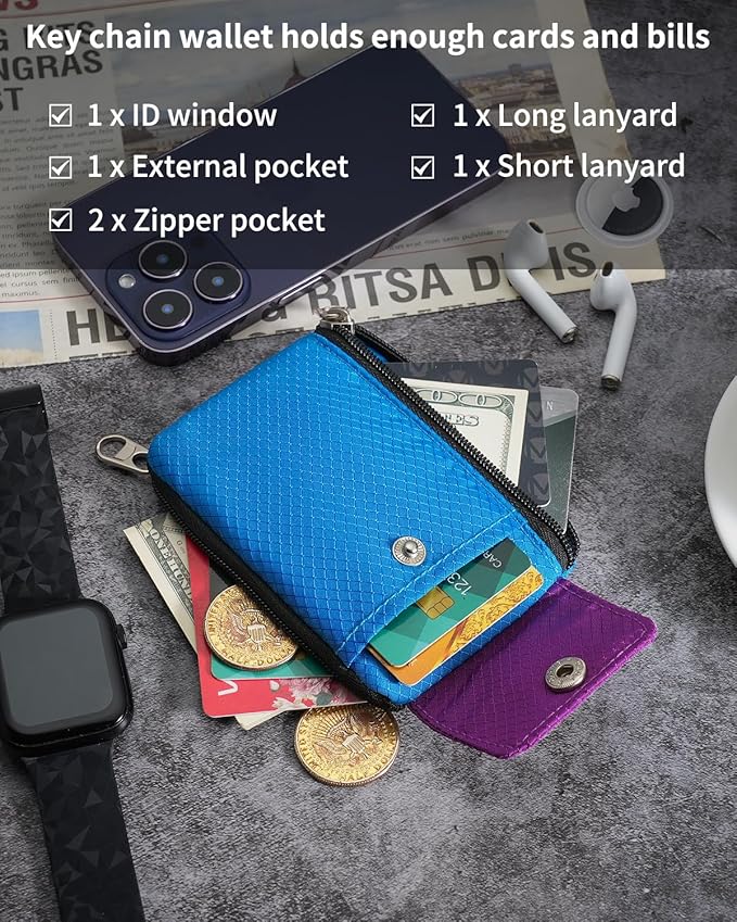 Minimalist Wallet For Mens Womens, Keychain RFID Blocking Zipper Small Wallet with ID Window 2 Lanyards,Water Resistant Travel Cash Card Coin Case Boys Girls