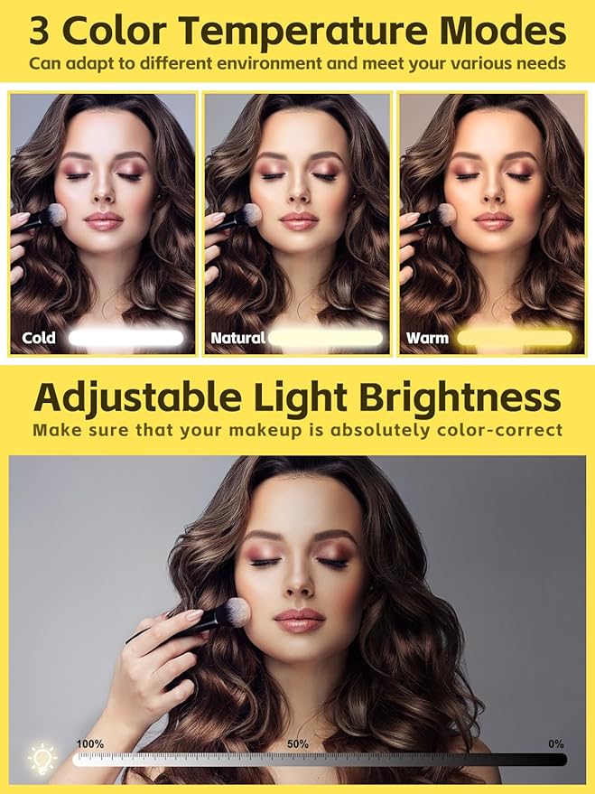 - 💄【4K Mirror with 3 Color Lights】Kalolary cosmetic case features with a 4k full-screen light mirror, which has 3 adjustable color light, gently touch the switch can easily adjust the color temperature between cold light, natural light and warm light, long press can adjust light brightness from 10% to 100%, giving you color-corrected, flawless makeup application every time. And the mirror angle is also adjustable allows multiple angle for your convenience.