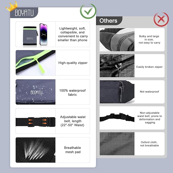 - Reflective and Waterproof: Safety's key with our waist pack's four reflective strips, keeping you visible during those late-night or early morning runs. And if it starts to rain, no sweat your phone, headphones, keys,cards and cash stay safe and dry.