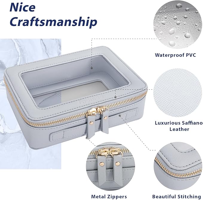 - ❤【LUXURY DESIGN】Measuring 9'' x 6.5'' x 3''(23cm x16.5cm x 7.8cm), our makeup bag is sleek and stylish, this makeup travel organizer was designed in a minimalist boxy shape and an elegant pearl blue color. Crafted in beautiful PU leather and finished with polished hardware, it's the clear pouch you'd be happy with sitting out on display beside you.