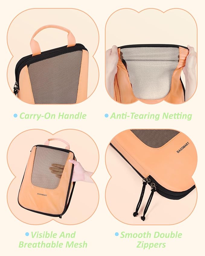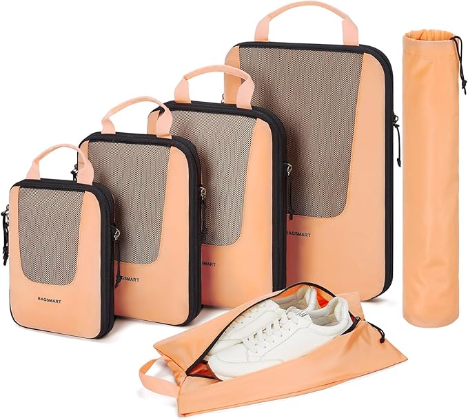 - Compression Packing Cubes - Are you fed up with the travel kind of messy suitcase? Travel with BAGSMART PACKING CUBES and they make a world of difference. The 6-piece packing cubes contains 4 travel cubes + 1 laundry bag + 1 shoe bag, keeps your outfits in separate compression cubes, and makes your luggage clean and neat while traveling