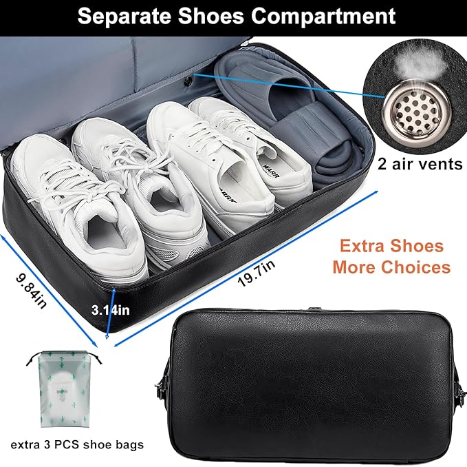 - Leather Weekender Overnight Bag for Men Women with Shoes Compartment: This leather travel tote bag has a separate zipper compartment on the bottom, so you can put your shoes or dirty clothes apart from your clean clothes. Very useful and keeps the top clean. With 2 vent holes, shoes won't get smelly or make your travel weekender bag smelly. You can also put anything else you want to keep separate from the rest of your belongings, very handy and space saving