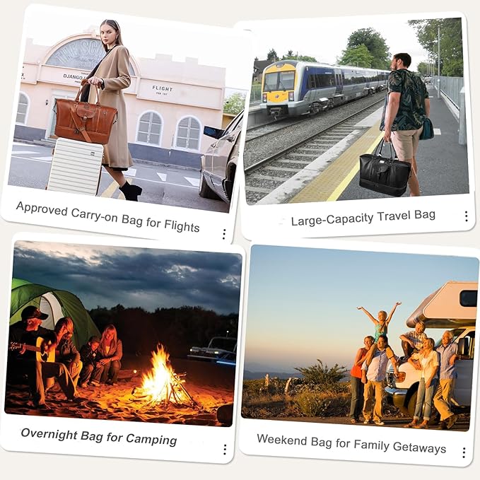 - Functional Leather Travel Bag for Men Women: Stylish, spacious and sturdy. This men womens duffel bag is a good size to carry your travel items and make them very organized and easier to access. Pefect work as a women's weekender bag, mens overnight bag, personal item bag, carry on luggage bag, gym bag, hospital bag, and airplane carry on bag. Ideal for a weekend getaway, over night stay, business trip, beach trip, road trip, week vacation, cruise travel, camping or fitness