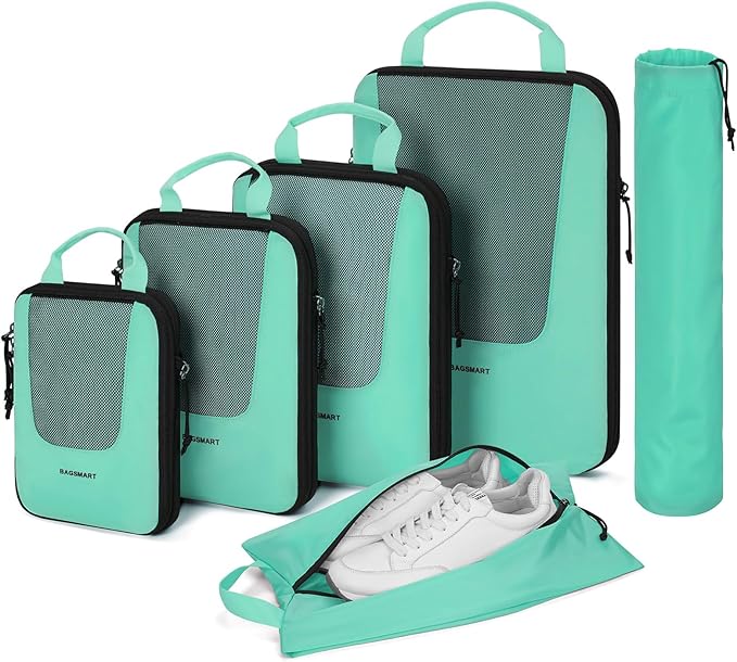 - Compression Packing Cubes - Are you fed up with the travel kind of messy suitcase? Travel with BAGSMART PACKING CUBES and they make a world of difference. The 6-piece packing cubes contains 4 travel cubes + 1 laundry bag + 1 shoe bag, keeps your outfits in separate compression cubes, and makes your luggage clean and neat while traveling