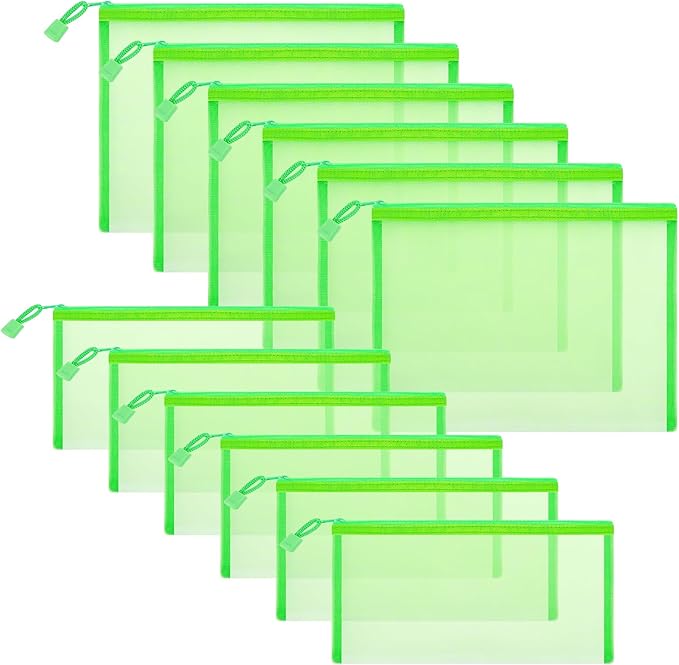 12 Pieces Zipper Nylon Mesh Pouch, Mesh Cosmetic Bags Makeup Bags Pencil Case, Multipurpose Travel Bags for Cosmetic School Office Supplies and Travel Accessories (Green, A5+B6)