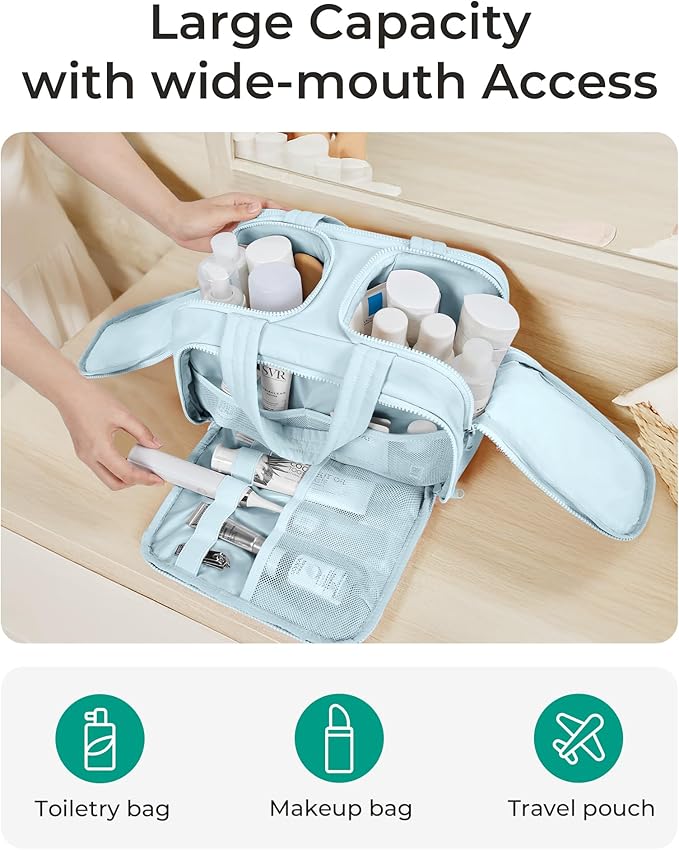 - Easy Access and Keep Upright : Full opening and not piling up for easy access to items. Double side full open design of travel bag for toiletries keeps cosmetic bottles and toiletries can stand upright in the middle compartment. Avoid leakage during transit