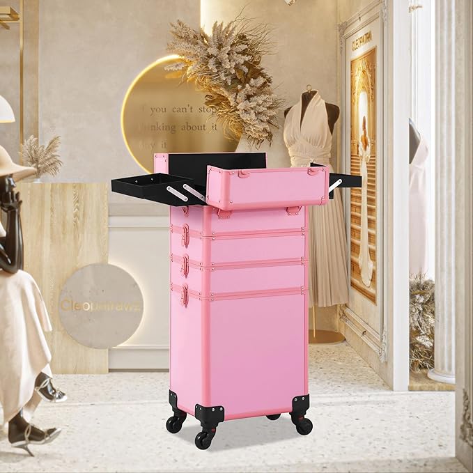 Makeup Train Case, Rolling Makeup Case with Lid, 5 in 1 Cosmetology Case on Wheels, Christmas Gift, Large Makeup Case Organizers, Profesional Cosmetic Case for Salon Barber, Pink