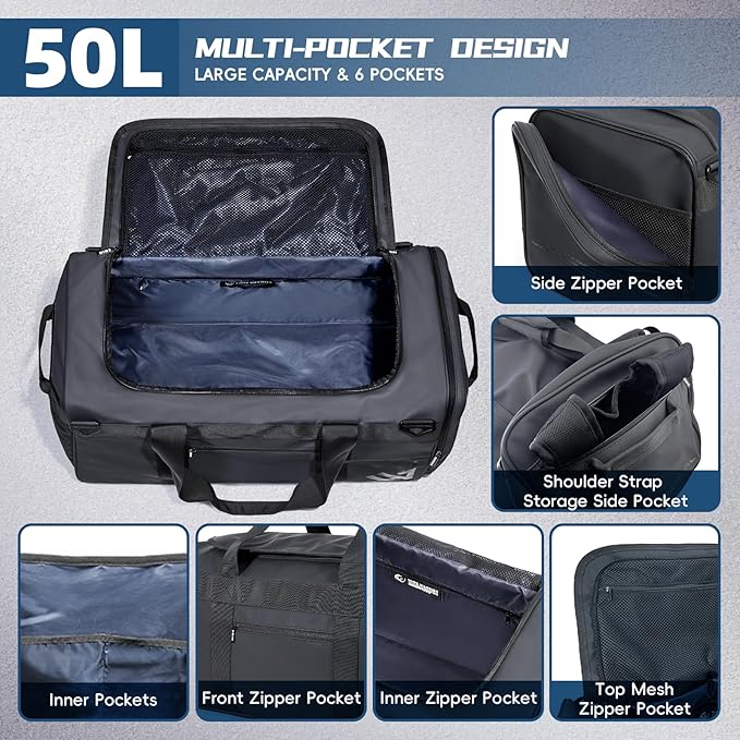 - [Large Capacity Duffel Bag] Measuring 23.6"L X 11.5"W X 11.8"H with 50L Capacity, enough room for your sports gears ,basketball, football and traveling necessities. It features 4 internal pockets,including 2 inner pockets, 1 zipper pocket and 1 mesh zipper pocket on top to separate small accessories, it fits for 3-5 days travel/adventure, or for more bulky sports gears, Note: The bag is made of heavy duty material, not suitable for traveling light