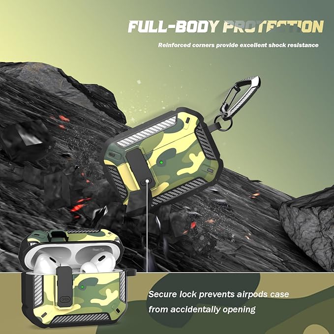 RFUNGUANGO for AirPods Pro 2nd Gen Case with Cleaning Kit, Military Hard Case Protective Armor with Lock, for AirPod Gen 2 Charging Case (2023/2022/2019, 2nd Gen/1st Gen),Rainforest Camouflage