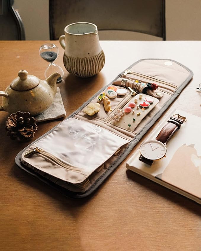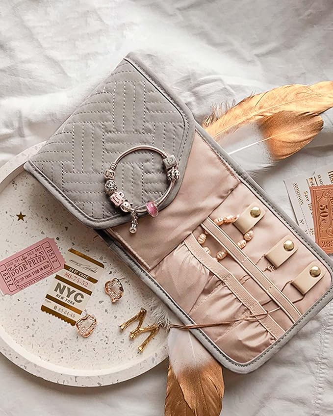 BAGSMART Travel Jewelry Organizer Case Foldable Jewelry Roll for Journey Rings, Necklaces, Earrings, Bracelets,Mini,Warm Gray