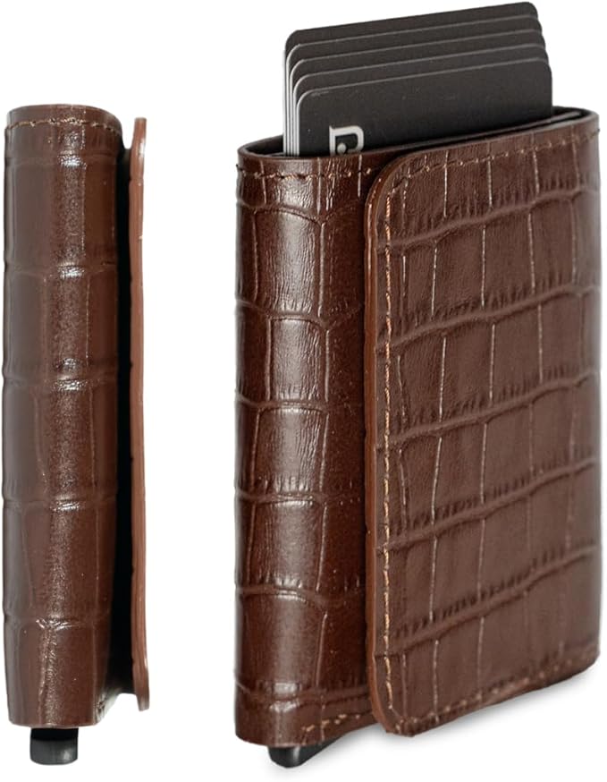 Jenoss Smart Wallet For Men: Full Grain Leather, Handcrafted, Slide Metal Pop Up Case, Slim RFID Blocking Credit Card Holder, Minimalist, Compact, 6-8 Cards Organizers, Front Pocket, Clip (Burgandy)