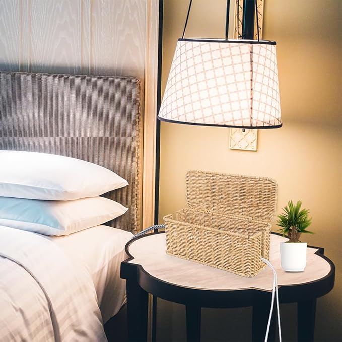- Elegant & Safe Handwoven Synthetic Rattan: Our Cantalop Cord storage organizer with attached lid boasts a handmade polypropylene rattan like plastic, adding a touch of rustic elegance to any room. This cable organizer is carefully designed to hide wires and improve your space with a charming touch.