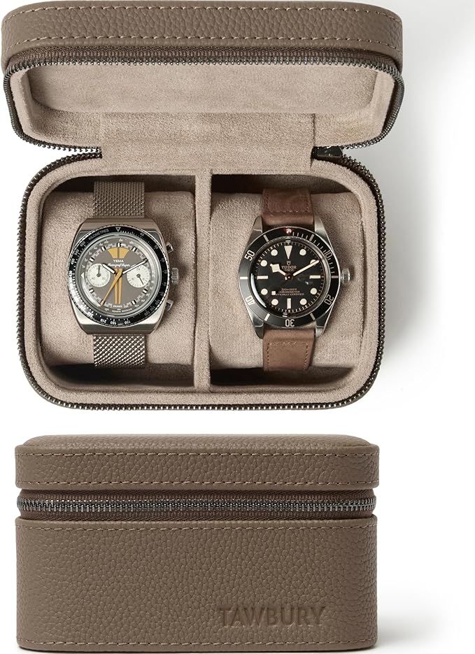 TAWBURY 2 Watch Travel Case - Genuine Top-Grain Leather Watch Box for Men & Women with Metal Zipper and Extra Wide Pillows for Large Watches (Taupe)