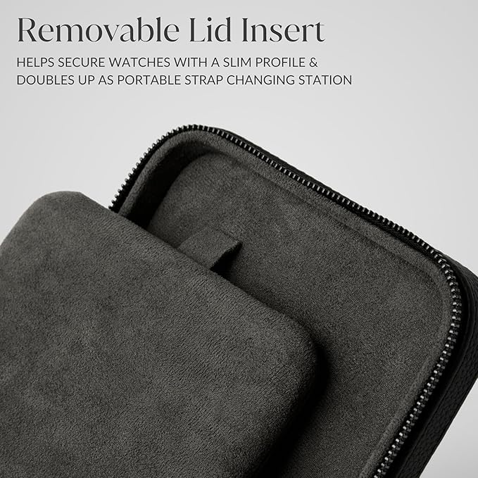 - Adapting to Your Watch: The watch carrying case is equipped with an innovative, removable lid insert, which creates space for larger watches when removed, provides even greater protection for slimmer timepieces, whilst also conveniently doubling up as a cushioned platform for strap changing whilst travelling.