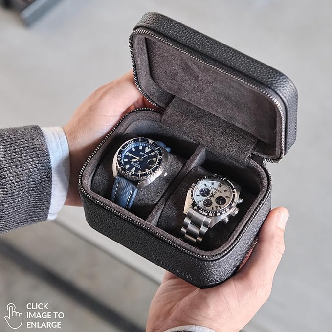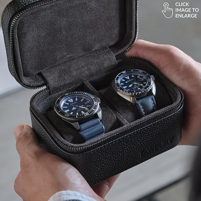 TAWBURY Watch Case - 2 Slot Watch Box for Men & Women with Genuine Top-Grain Leather Exterior, Metal Zipper and Extra Wide Pillows for Large Watches (Black)