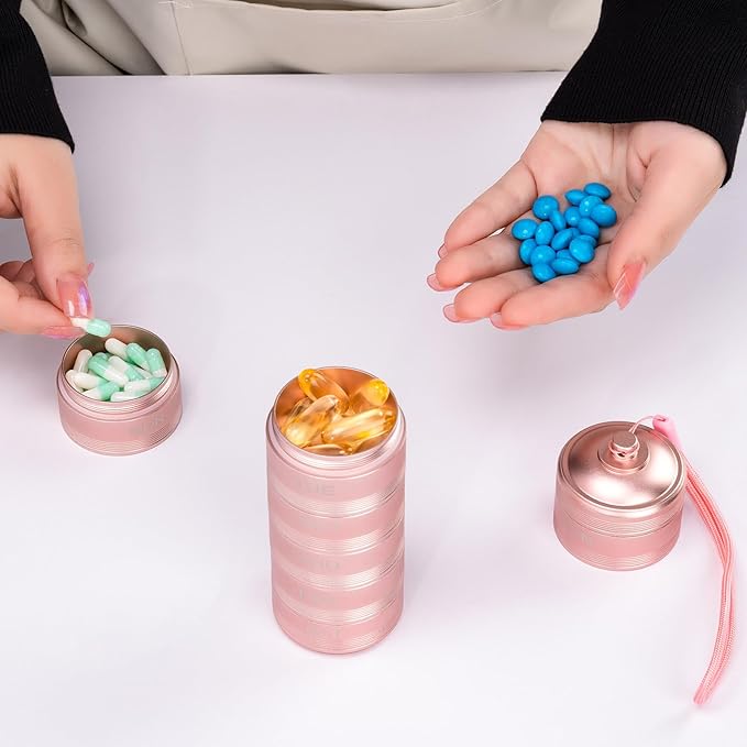 Travel Pill Organizer 7 Day - Waterproof Metal Weekly Pill Box Daily Pill Case with 7 Compartments, Pill Container for Vitamin Medicine Supplements Fish Oil, Pink Daily Pill Organizer