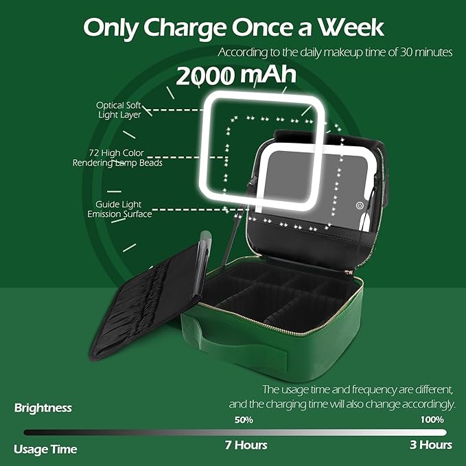 MOMIRA Travel Makeup Bag Cosmetic Bag Makeup Organizer Bag with Lighted Mirror, Adjustable Brightness in 3 Color Scenarios, Waterproof Makeup Train Case, Gift for Women - Emerald green