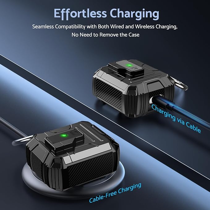 - [Convenient Charging & Portability] The case supports both wired and wireless charging for your Airpods case. The front LED remains visible to show the charging status. An included portable carabiner allows you to conveniently take your Airpods case with you during outdoor activities like climbing, hiking, and travelling.