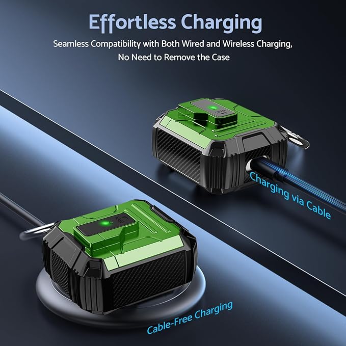 - [Convenient Charging & Portability] The case supports both wired and wireless charging for your Airpods case. The front LED remains visible to show the charging status. An included portable carabiner allows you to conveniently take your Airpods case with you during outdoor activities like climbing, hiking, and travelling.