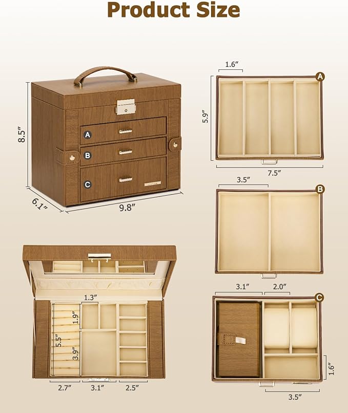 - Travel Jewelry Box: The bottom drawer contains a travel jewelry case. The mini travel jewelry case is 2.72’’ L x 5.04’’W x 1.65’’H, making it easy to fit into your handbag or suitcase. Perfect for any travel!