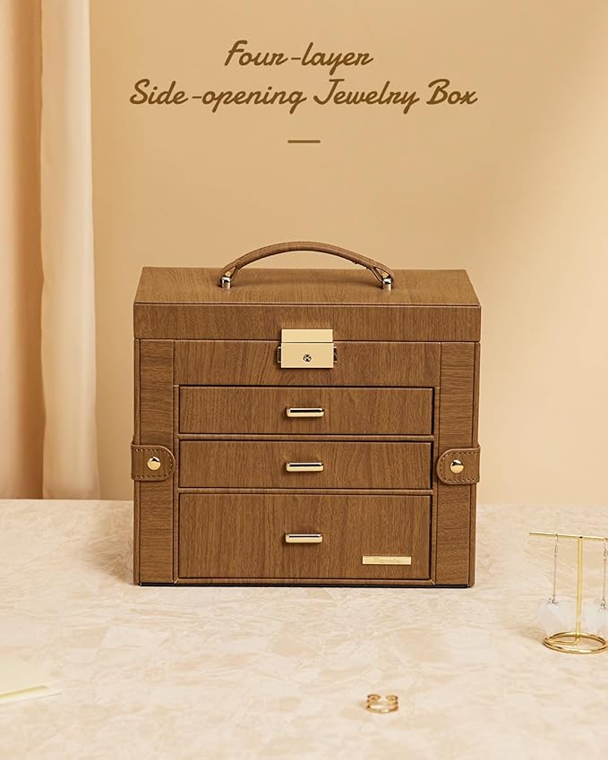 - Practical Structure: The 4-layer jewelry box features 3 pull-out drawers, 2 side doors with 16 necklace hooks, a ring holder, 4 removable earring cards, 10 compartments of different sizes, 2 removable watch pillows, and a travel jewelry case. It is suitable for rings, earrings, ear studs, bracelets, bangles, necklaces, chains, watches, glasses, sunglasses and other jewelry accessories