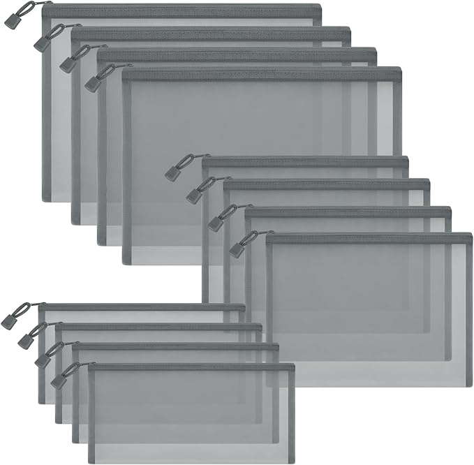 12 Pieces Zipper Nylon Mesh Pouch, Mesh Cosmetic Bags Makeup Bags Pencil Case, Multipurpose Travel Bags for Cosmetic School Office Supplies and Travel Accessories (Grey, Assorted Sizes)