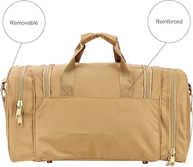 - 【Size and material】There are two model of this gym bag,model A and model B,model B will add the "B" front the color,like "TAN-B". The military duffel bag with 21”*10”*13” for model AB. This shoulder bag is made of 600 denier polyester lined with PVC and waterproof,wearable and durable