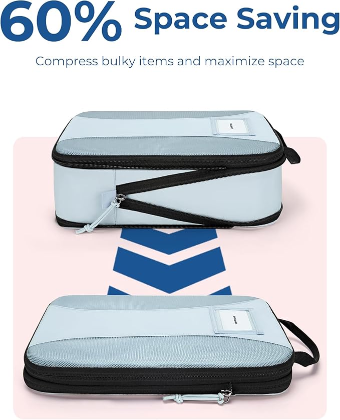 • Maximize Space - BAGSMART 6 pcs Compression Packing Cubes, a true game changer for packing, make efficient use of every inch in your luggage. The exterior zipper allows for maximum compression, just like a vacuum sealer. Simplify packing process and save time on your travels.