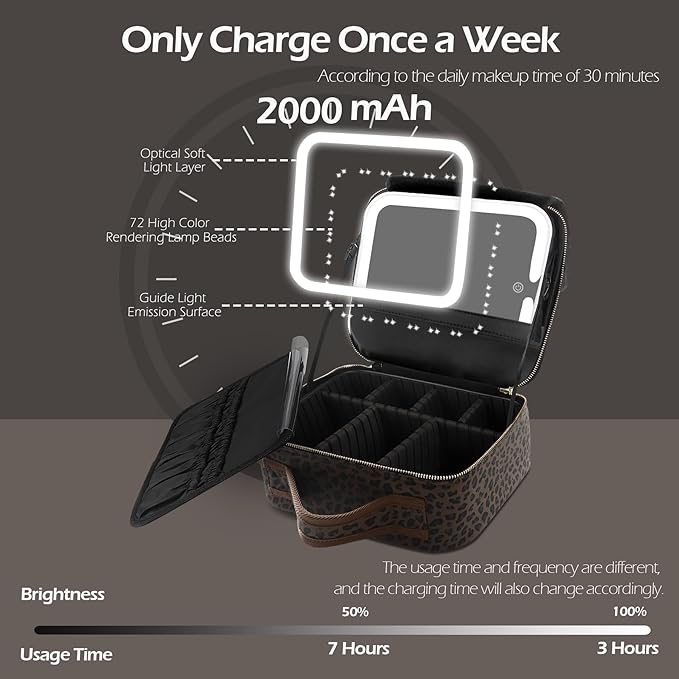 MOMIRA Makeup Train Case Makeup Bag with Light up Mirror Cosmetic Bag Organizer Detachable Portable Travel Makeup Case with Adjustable Dividers Makeup Brushes Storage, Waterproof,Leopard-Dark brown