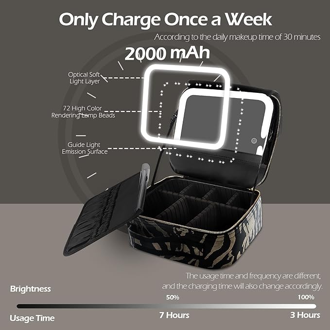 MOMIRA Travel Makeup Bag Cosmetic Bag with Lighted Mirror, Adjustable Brightness in 3 Color Scenarios, Waterproof, 10x Magnifying Mirror, Rotatable Independent Light Mirror- Zebra-Beige
