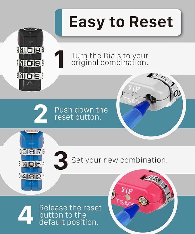 - [EASY TO READ AND SET DIALS] The numbers on the dials are easy to read without reading glasses, and you never need to worry about losing the key to your lock. You can easily reset the combination with a pen or other tool, with no worries about resetting it accidentally.