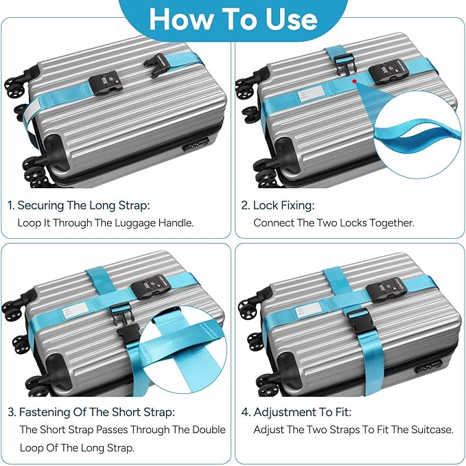 - 【Adjustable Length Luggage Straps】 Belt length: a. 47.2"-81.1" / 120-205 cm; b. 39.4"-73.6" / 100-187 cm; Luggage straps fit for 20” - 34” suitcase. Suitable for suitcase, luggage bag, backpack, duffel bag, etc. You can customize the length according to your needs, ensuring a secure and sung fit that prevents any sliding or loosening of the luggage.