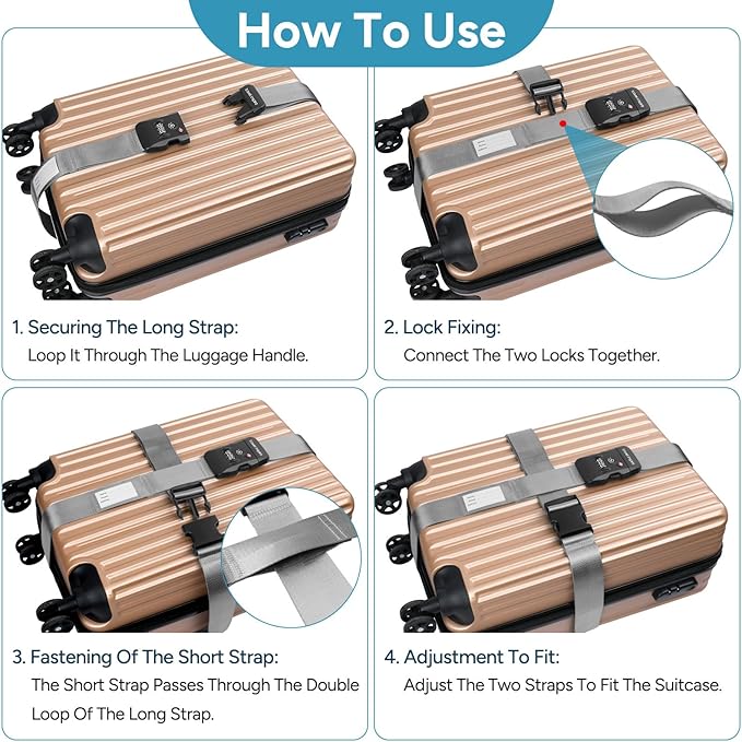 - 【Adjustable Length Luggage Straps】 Belt length: a. 47.2"-81.1" / 120-205 cm; b. 39.4"-73.6" / 100-187 cm; Luggage straps fit for 20” - 34” suitcase. Suitable for suitcase, luggage bag, backpack, duffel bag, etc. You can customize the length according to your needs, ensuring a secure and sung fit that prevents any sliding or loosening of the luggage.